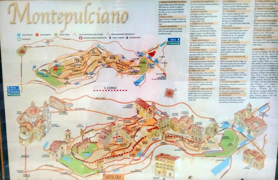 Da un porta di ingresso (Porta di Gracciano) percorrendo un via ricca di negozi di prodotti tipici si arriva nel punto piu’ alto in Piazza Grande, centro monumentale della città dove si trovano il palazzo comunale